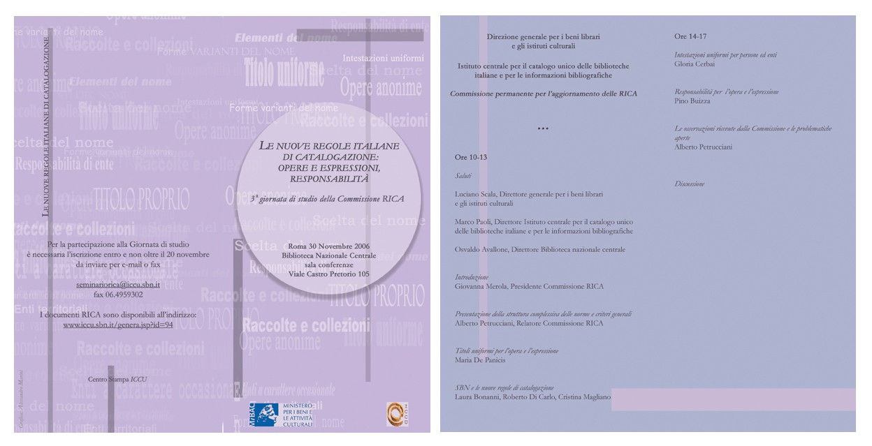 Si svolgerà a Roma il 30 novembre 2006, presso la sala conferenze della Biblioteca Nazionale Centrale, la 3° giornata di studio della Commissione RICA su "Le nuove regole di catalogazione: opere ed espressioni, responsabilità".